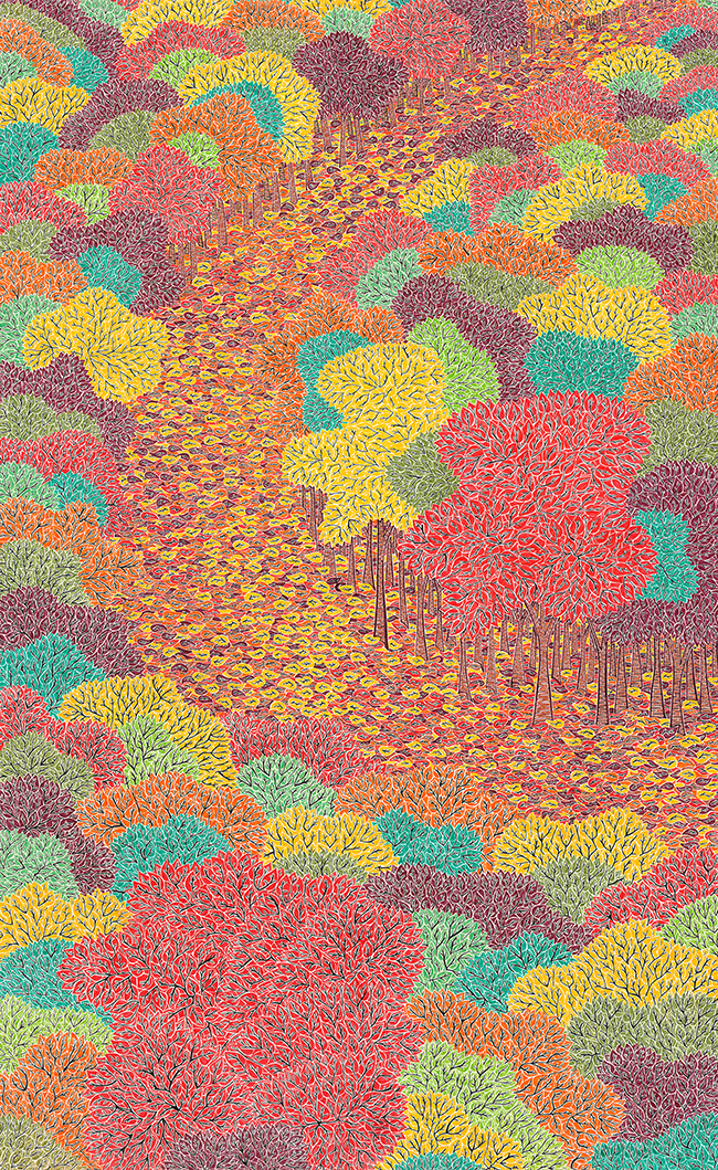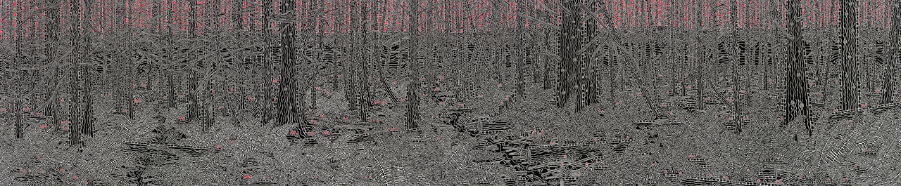 Even an image as dense and busy as The Fall of Autumn, which offers an aerial perspective of the season’s splendours, and appears at first glance to be an impenetrable forest canopy, reveals a continuum of white space between all the vivid colours, right down to individual leaves. Or as you approach the tangled West Coast panorama of Nitinat Lake Beware, again you will find ‘negative space’ between and even through the abstract representations of ferns, trees, and an ominous red sky in the distance.