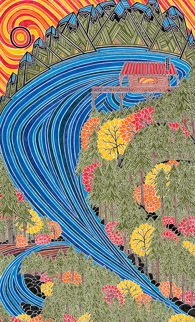 But his experiences as an avid angler, who has trekked into BC’s wilderness and travelled to tropical climes in pursuit of a catch, aren’t depicted representationally. Wilson meticulously renders his images in pen and ink drawings, and if you look closely, you will almost always find there’s whitespace between the thousands of elements that come together in his works like an unimaginably complex puzzle.